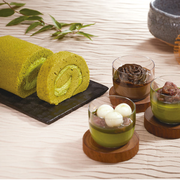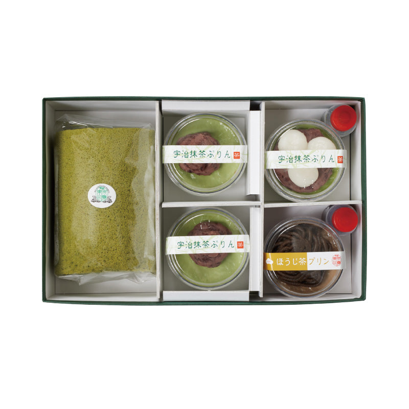 ●内容量:贅沢抹茶ロールケーキ×1、宇治抹茶プリン95g×2、宇治抹茶白玉プリン115g×1、宇治ほうじ茶プリン95g×1、宇治抹茶みつ15g×1、黒みつ15g×1